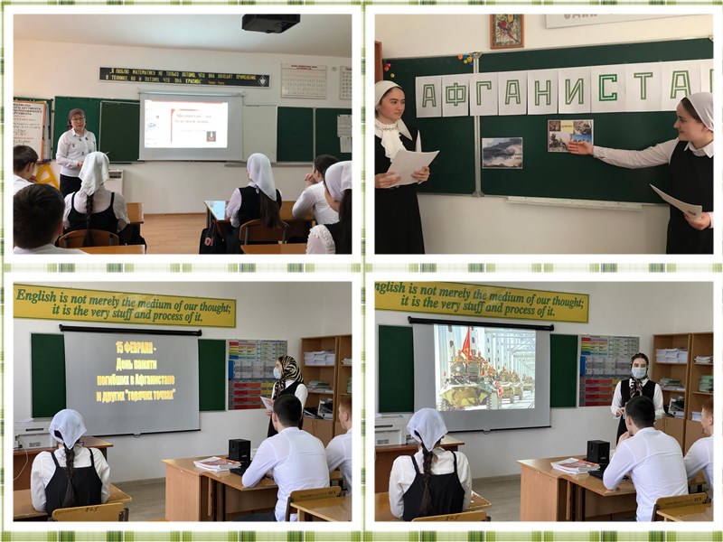 15 февраля в нашей школе прошёл единый тематический день, посвящённый Дню воина-интернационалиста. Классные руководители разработали и провели классные часы, беседы и уроки мужества, посвященные 32 годовщине вывода Советских войск из Афганистана «Афганистан – наша память и боль». Обучающиеся школы под руководством классных руководителей выступили с сообщениями о тяжелых климатических условиях, в которых воевали советские солдаты, о душманах, постоянно нападающих на солдат, о героических подвигах наших воинов - земляков. Зачитали стихи, посвященные этим событиям. 15 февраля учителем истории Даудовой М.Б. среди обучающихся 11 класса проведен урок истории «Афганская война 1979-1989». На уроке ребята познакомились с воинами-интернационалистами, узнали об их не лёгких днях и тяжелых боях, проведённых в республике Афганистан. Понимание трагедии произошедшей там, на афганской земле, читалось в глазах ребят. Сухие цифры статистики вызывали удивление на лицах ребят. Сколько убито, сколько ранено, сколько искалечено тел и душ афганцев. Чудовищно звучали цифры погибших в момент вывода войск с территории Афганистана. То, что в классе не осталось ни одного равнодушного можно было не сомневаться. Минутой молчания почли всех не вернувшихся с той войны.