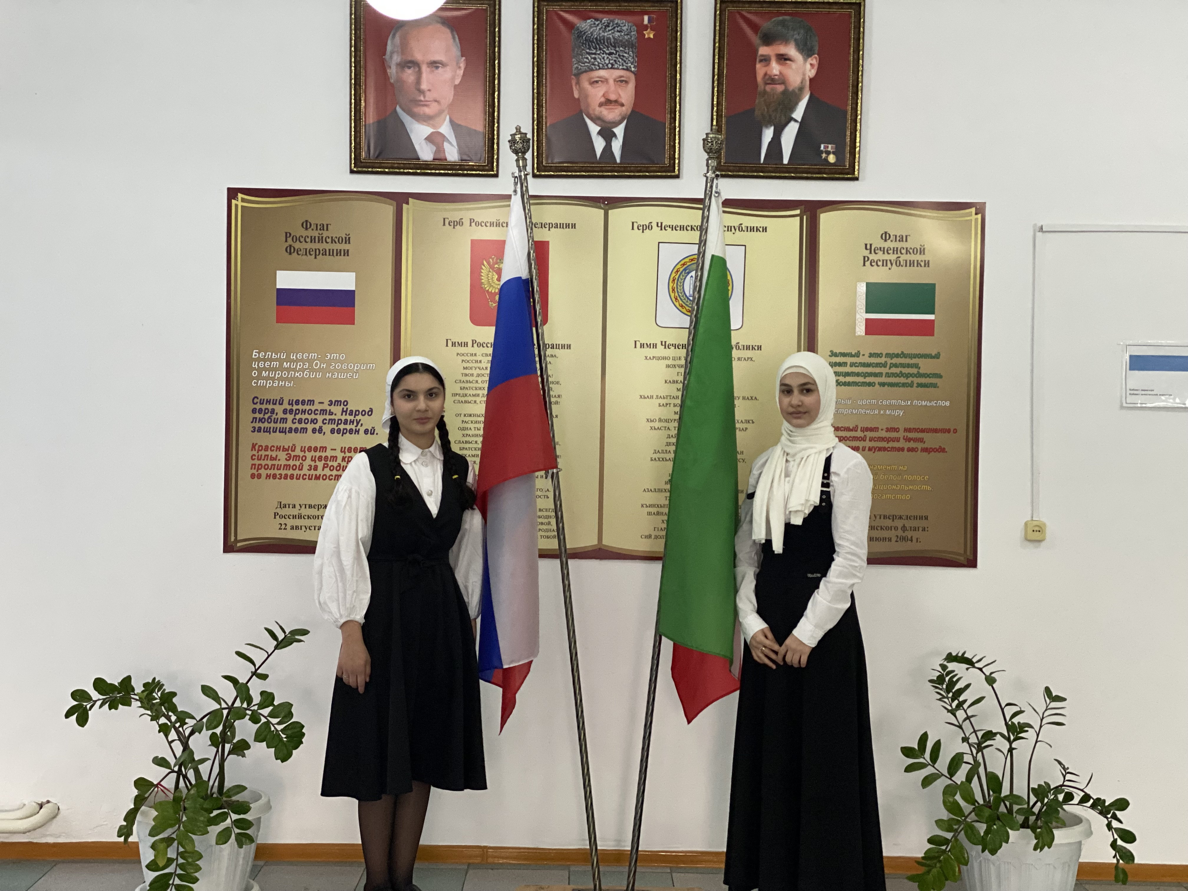Торжественная линейка с выносом государственного флага Российской Федерации, Чеченской Республики и звучания гимна РФ и ЧР.