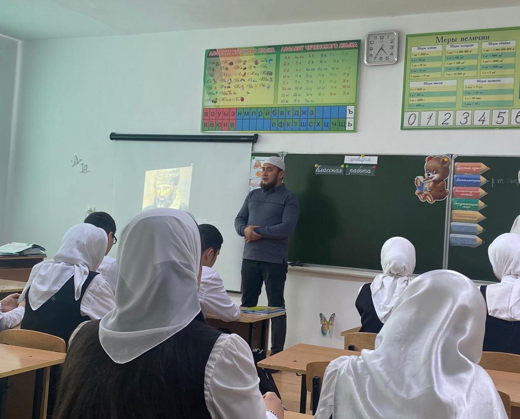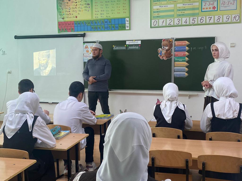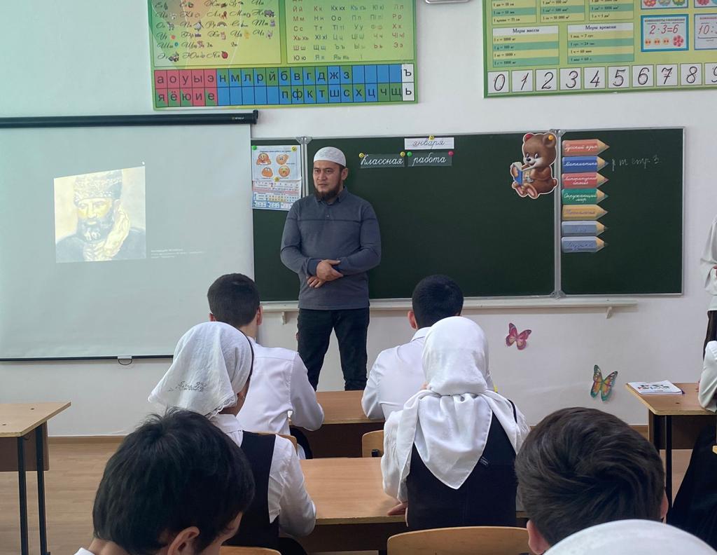 На беседу с обучающимися пришел помощник имама с.Воскресеновское Есенбулатов Мурат Сайдулаевич. В ходе беседы он рассказал присутствующим о жизнедеятельности выдающегося духовного наставника, его роли в деле распространения истинных ценностей Ислама, а также историю о дне выселки Великого устаза Кунта-Хаджи Кишиева (Да будет возвышенна его святость).