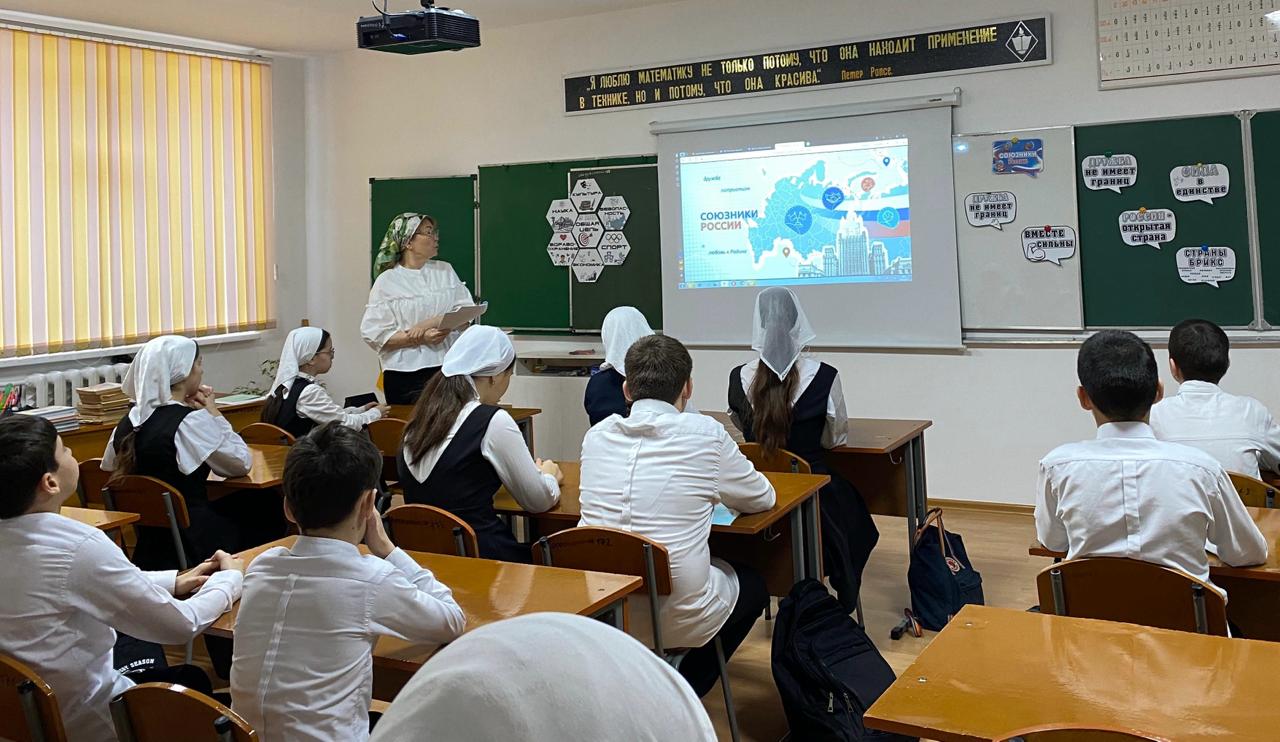 Вместе с педагогами обучающиеся обсудили тему взаимной поддержки, которая помогает государствам повышать уровень жизни своих граждан, развивать торговлю и экономику, обмениваться знаниями и опытом в различных сферах жизни общества.