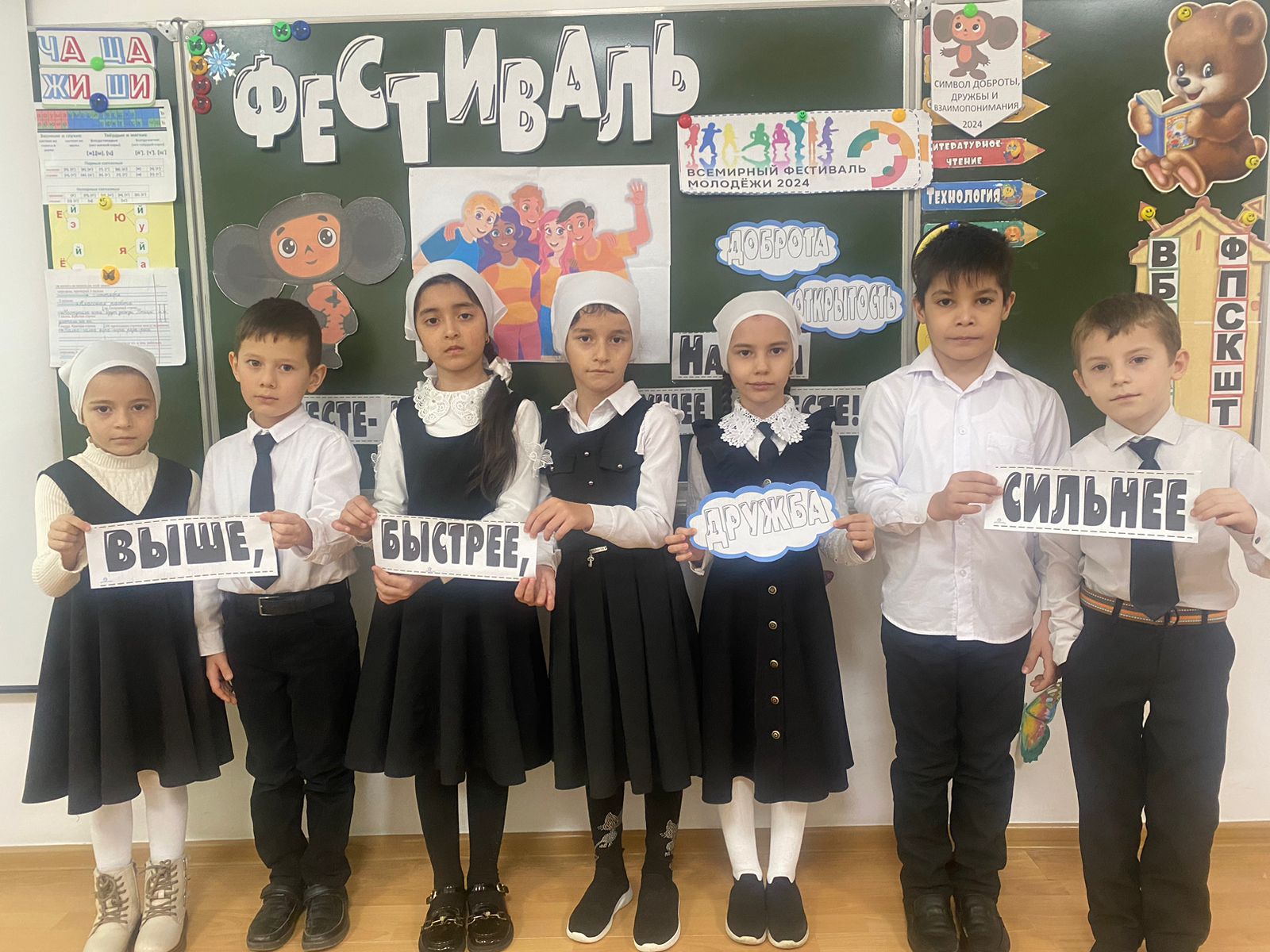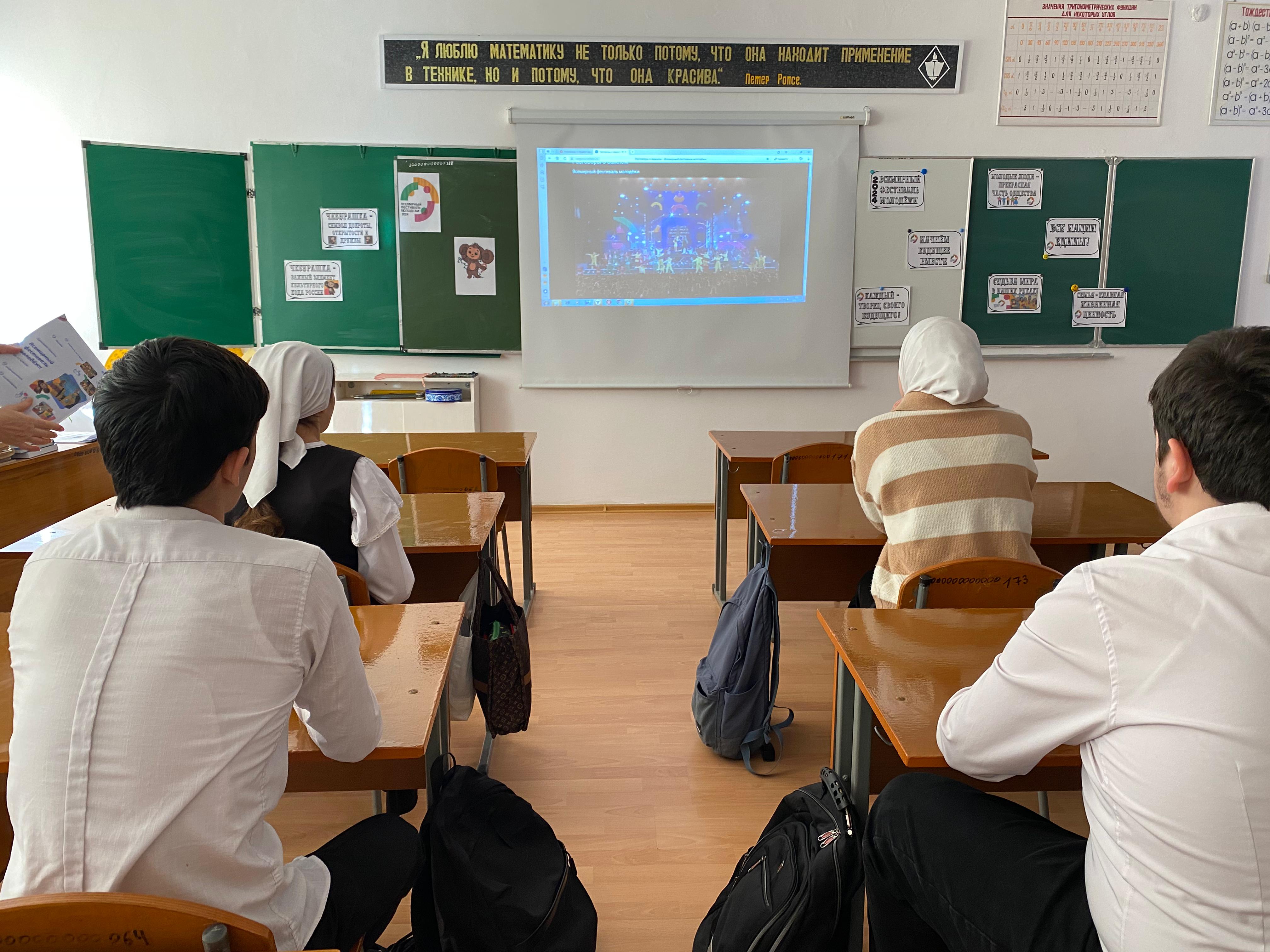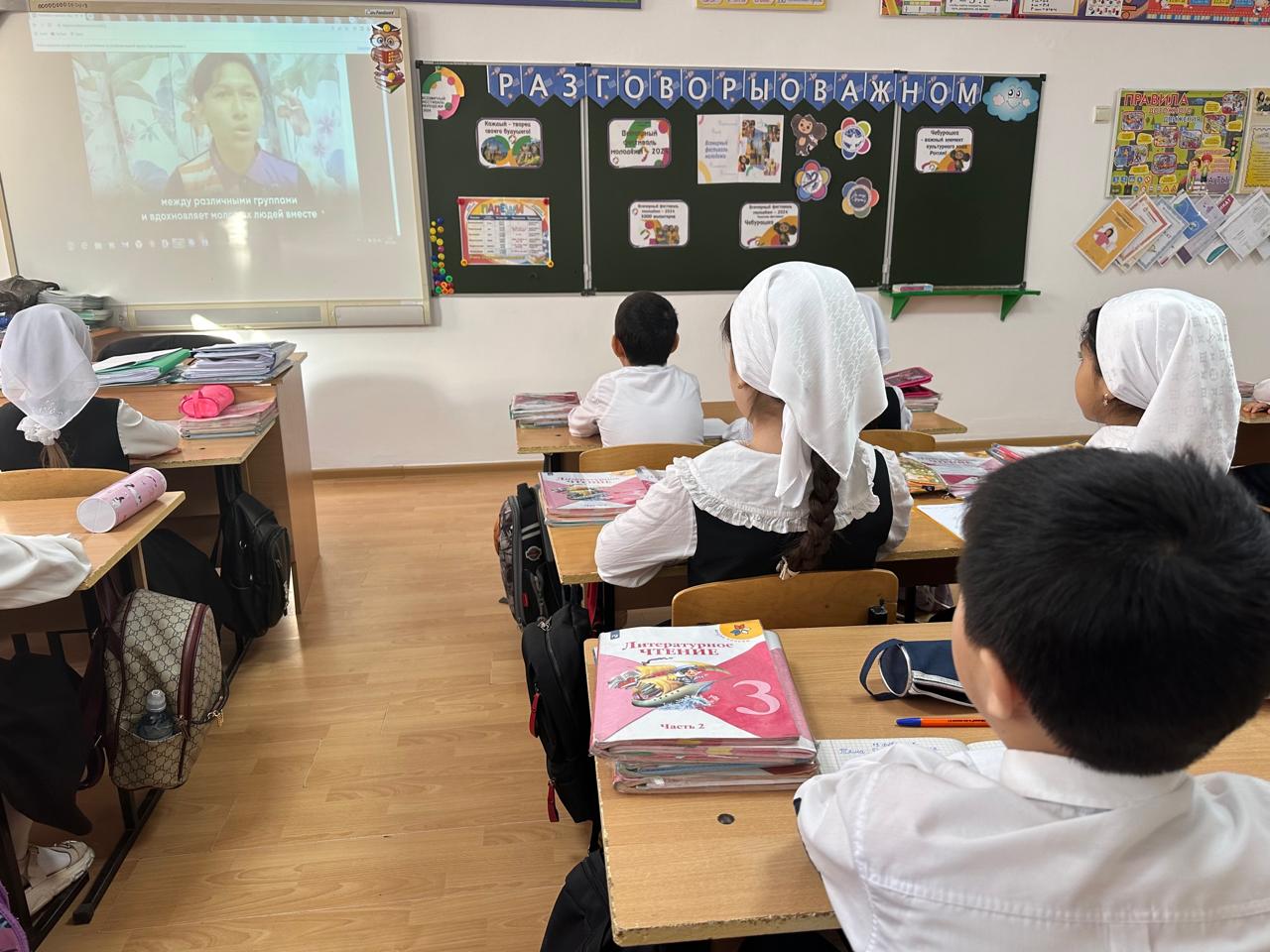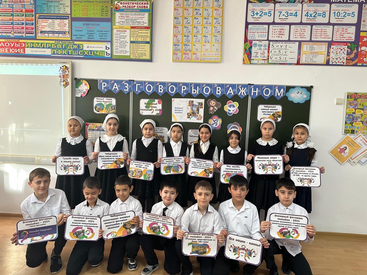 Ребята познакомились с направлениями Всемирного фестиваля молодёжи, узнали, какое значение имеет проведение Всемирного фестиваля молодёжи для России и всего мира. Вместе с учителями обучающиеся обсудили программу фестиваля и узнали ,что талисманом Всемирного фестиваля молодёжи стал Чебурашка, ведь он всегда верит в лучшее и мечтает о друге. А ещё он скромный, добрый и открыт всему миру, этот литературный герой олицетворяет основные ценности молодёжного форума – «Дружелюбие и взаимоуважение».