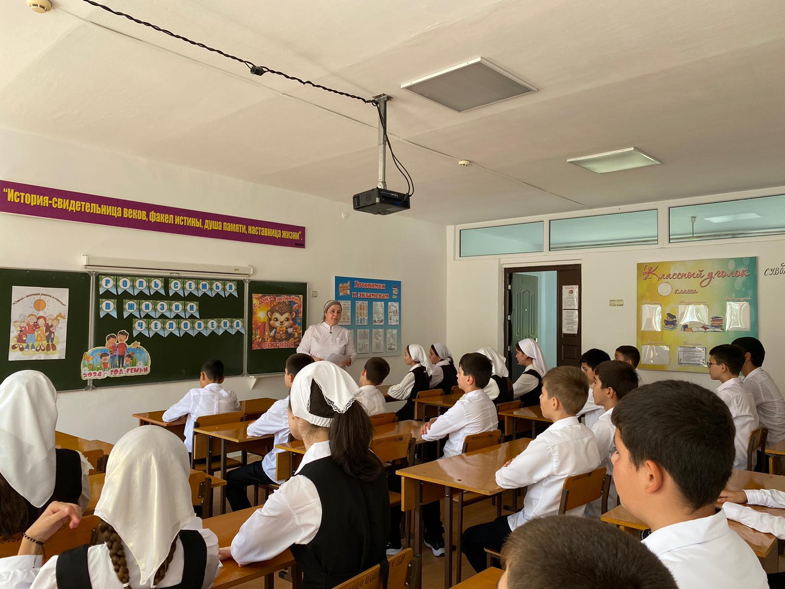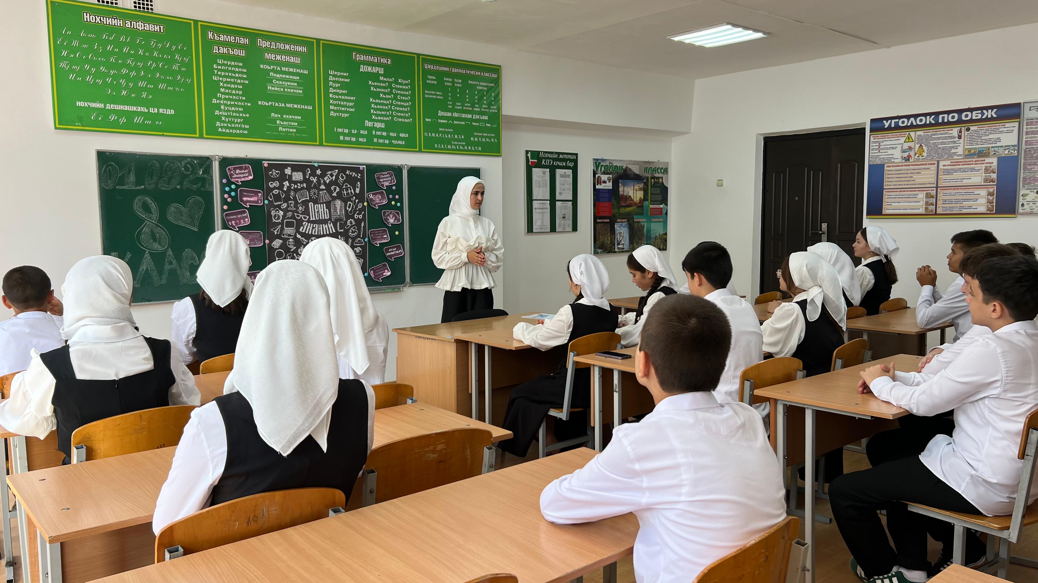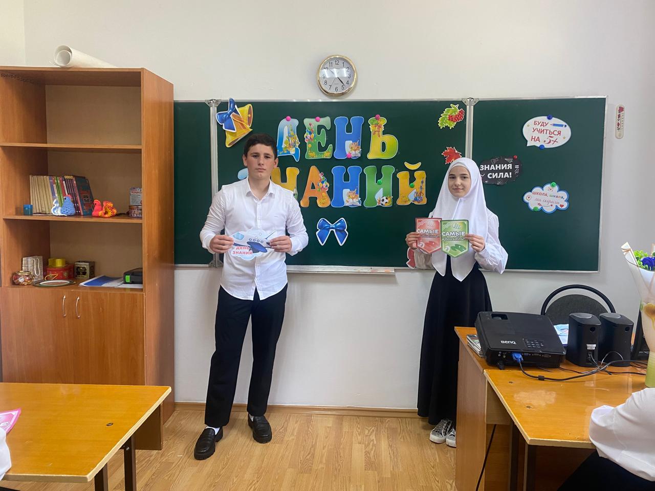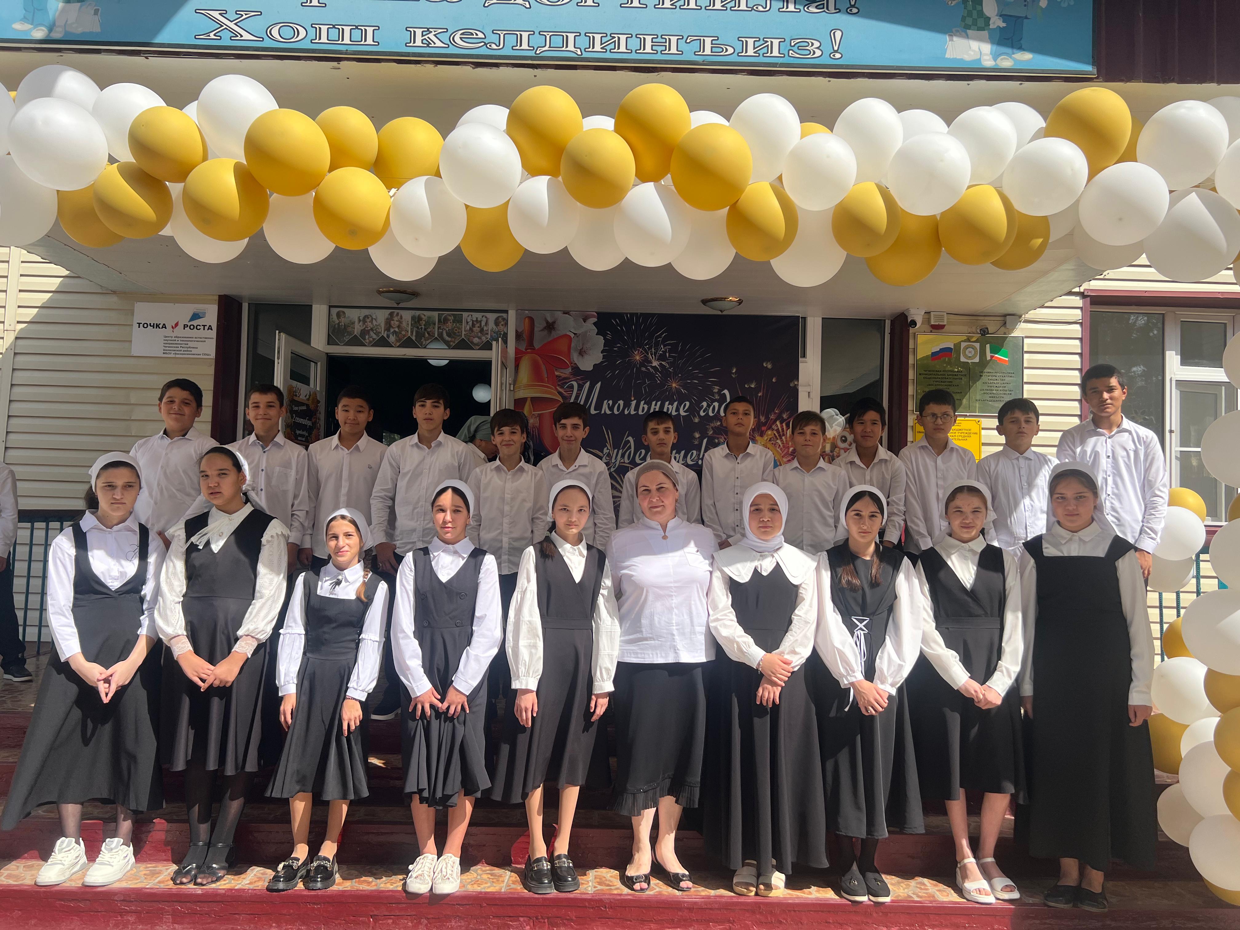 Открытие линейки было ознаменовано поднятием российского флага и исполнением гимна России и поднятием флага Чеченской Республики и исполнением гимна ЧР. Директор школы Чулаева Роза Висимирзаевна поздравила всех обучающихся, учителей и родителей (законных представителей) с началом нового учебного года.