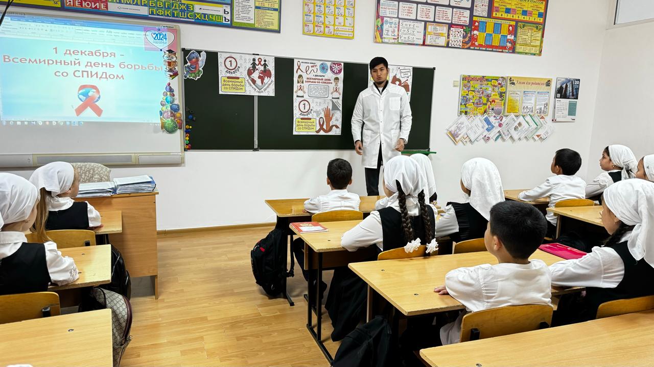Среди обучающихся 5 - 7 классов в этот день проведены классные часы на тему «СПИД- чума 21 века», «Знай и помни, чтобы жить». Классные руководители совместно с медицинским работником Акбердыевым М. И. познакомили ребят с историей Всемирного дня борьбы с ВИЧ/СПИДом, который служит делу укрепления организационных усилий по борьбе с пандемией ВИЧ-инфекции, продолжающей распространяться по всем регионам планеты.Каждый год Всемирный день борьбы со СПИДом проводится под различными девизами, отражающими существующие в данный момент насущные проблемы. Символом борьбы со СПИД является красная ленточка,и ни одна акция в этой области не обходится сейчас без нее. Обсудив видеоролик, дети пришли к выводу, день борьбы со СПИДом призван ломать стереотипы и оказывать все виды поддержки людям, встретившим этот ужасный недуг.