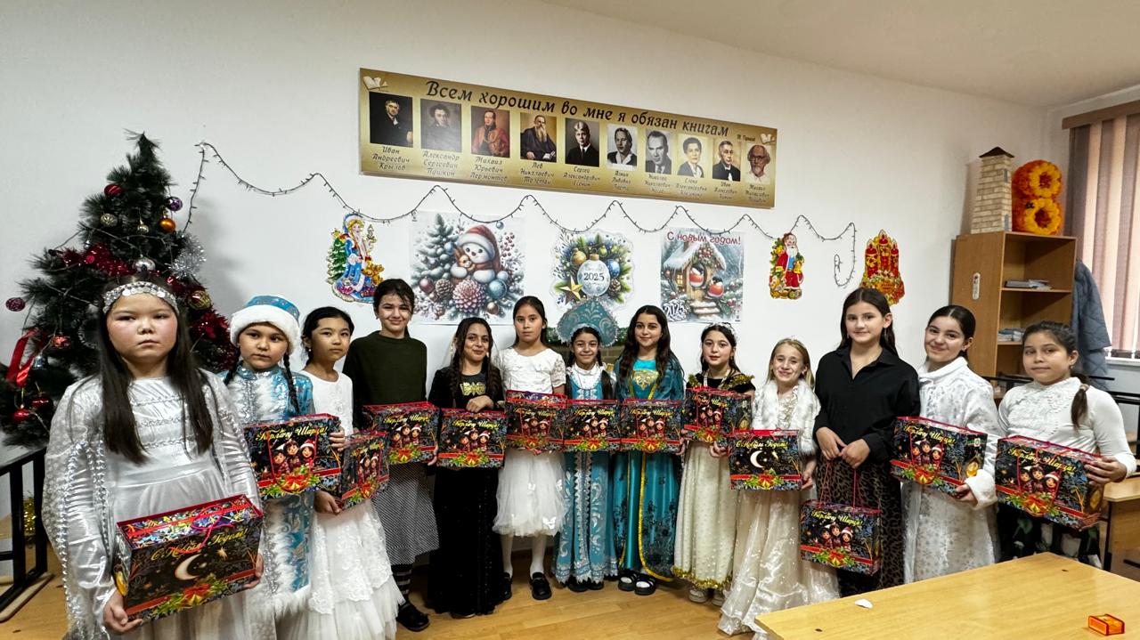 Разноцветные, сверкающие гирлянды и ярко украшенная ёлочка принесли детям ощущение чуда. Во время праздника сказочные герои увлекали детей в волшебный мир сказки. В гостях на празднике побывал веселый Снеговик, который хотел вместе со всеми встречать Новый год и веселил всех играми и забавами, Баба-Яга, Дракон как символ уходящего года, Змея –символ наступающего нового года, Тигр, Лошадь и конечно же Дед Мороз и Снегурочка. После новогодней сказки актеры вместе с ребятами провели веселый хоровод, разнообразные конкурсы и зажигательную лезгинку.